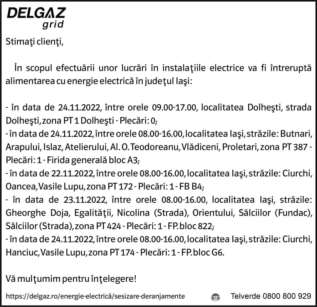 Anunțuri Delgaz gridAnunț Delgaz Grid 21 noiembrie 2022 / 1 de RedacțiaNovember 21, 2022November 21, 2022054 Share0