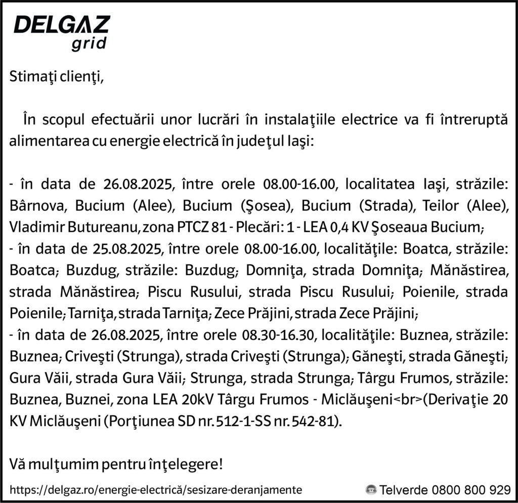 Anunțuri Delgaz gridAnunț Delgaz Grid 22 august 2025 / 2 de RedacțiaAugust 21, 2025August 21, 202507 Share0