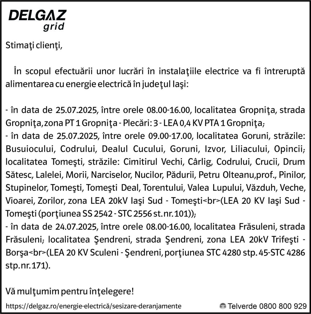 Anunț Delgaz Grid 22 iulie 2025