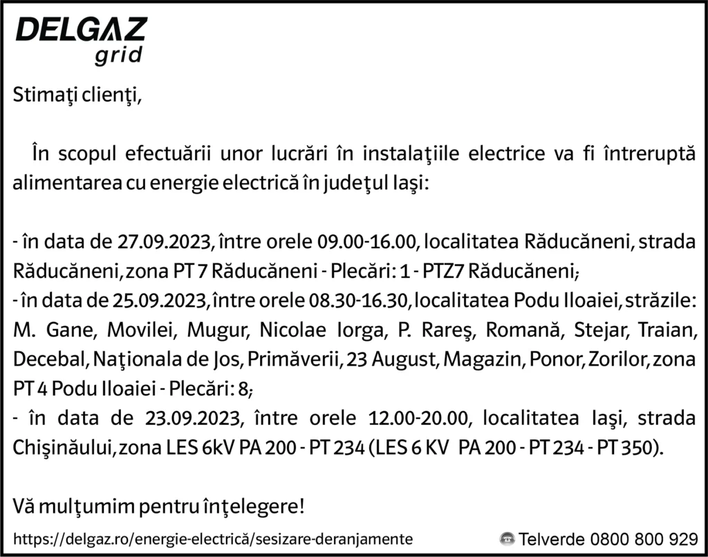 Anunțuri Delgaz gridAnunț Delgaz Grid 22 septembrie 2023 / 1 de RedacțiaSeptember 21, 2023September 21, 2023041 Share0