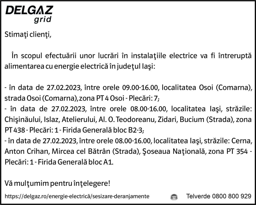 Anunțuri Delgaz gridAnunț Delgaz Grid 23 februarie 2023 de RedacțiaFebruary 22, 2023February 22, 2023083 Share0
