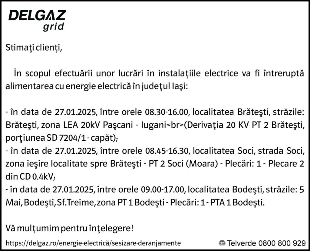 Anunțuri Delgaz gridAnunț Delgaz Grid 23 ianuarie 2025 de RedacțiaJanuary 22, 2025January 22, 2025030 Share0