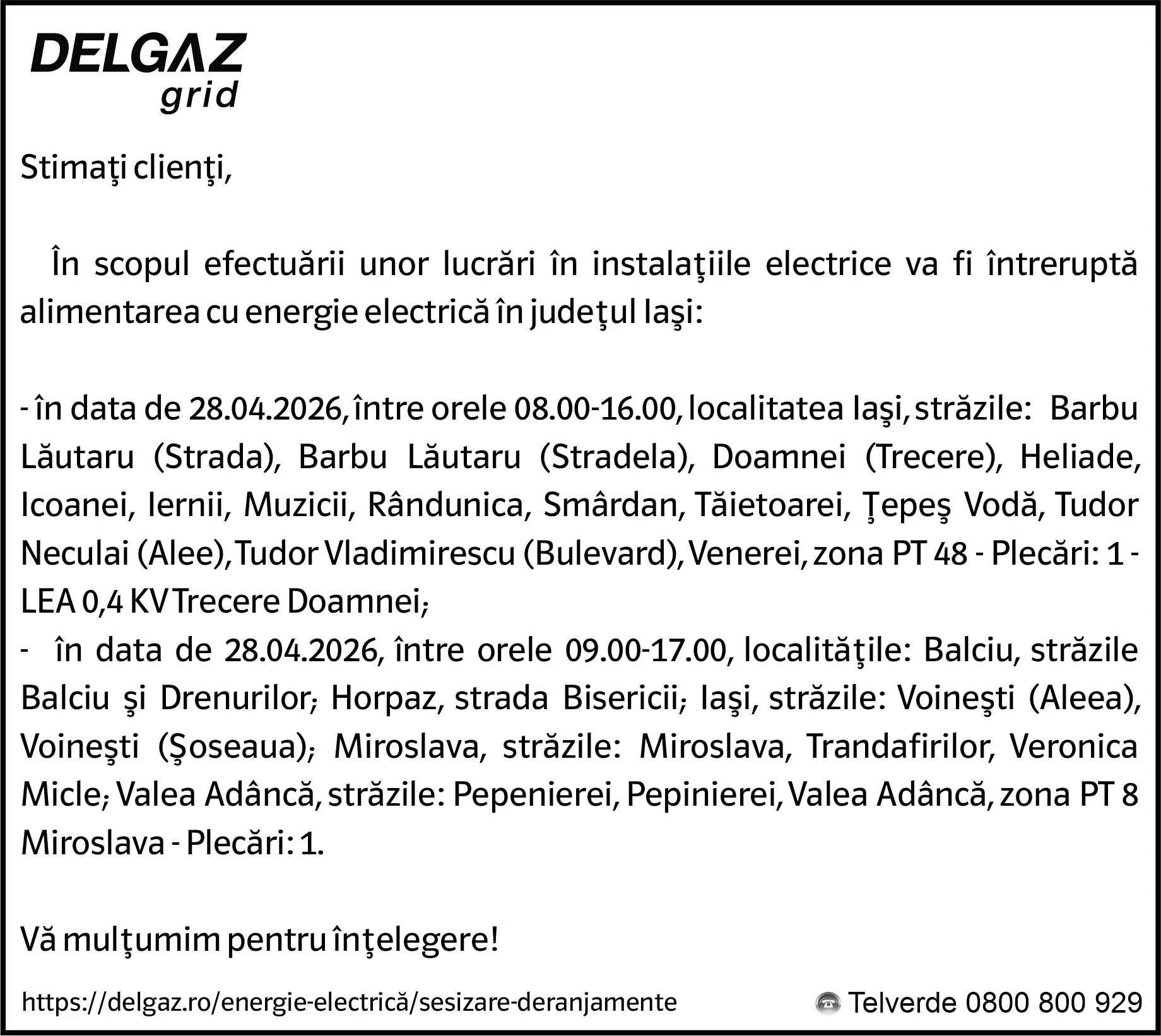 Anunț Delgaz Grid 24 aprilie 2026 / 1