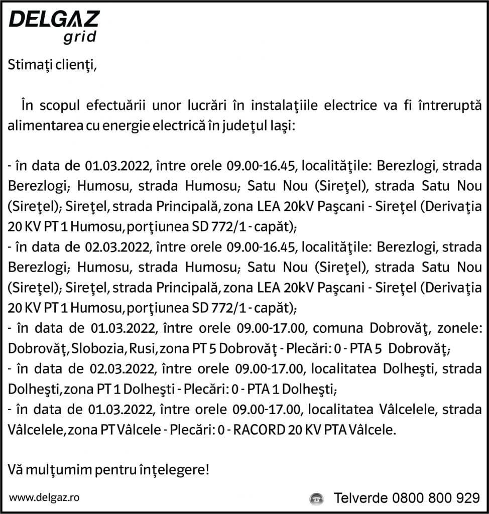 Anunțuri Delgaz gridAnunț Delgaz Grid 25 februarie 2022 / 1 de RedacțiaFebruary 24, 2022February 24, 2022061 Share0