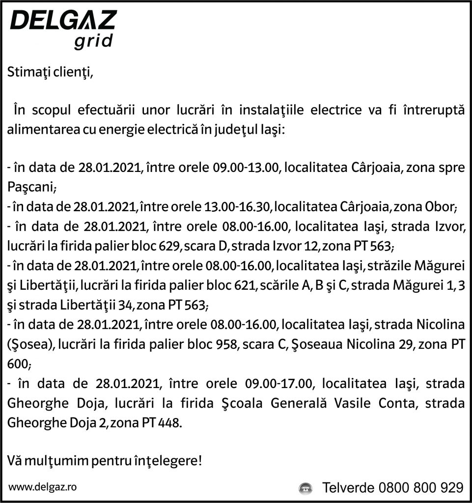 Anunțuri Delgaz gridAnunț Delgaz Grid 25 ianuarie 2021 / 1 de RedacțiaJanuary 25, 2021January 25, 2021014 Share0
