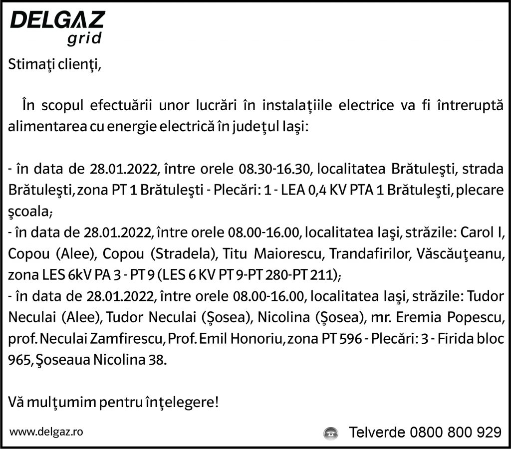 Anunțuri Delgaz gridAnunț Delgaz Grid 25 ianuarie 2022 / 1 de RedacțiaJanuary 21, 2022January 21, 2022032 Share0