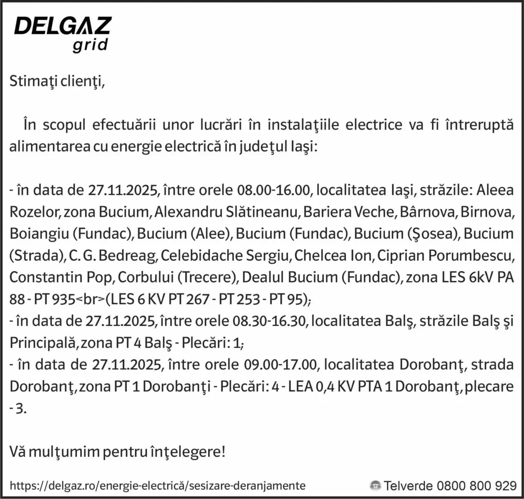 Anunțuri Delgaz gridAnunț Delgaz Grid 25 noiembrie 2025 / 3 de Răzvan GrecuNovember 24, 2025November 24, 202504 Share0