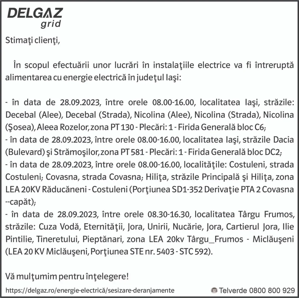 Anunțuri Delgaz gridAnunț Delgaz Grid 25 septembrie 2023 de RedacțiaSeptember 23, 2023September 23, 2023061 Share0