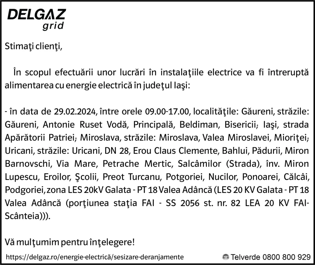 Anunțuri Delgaz gridAnunț Delgaz Grid 26 februarie 2024 / 3 de RedacțiaFebruary 25, 2024February 25, 2024035 Share0