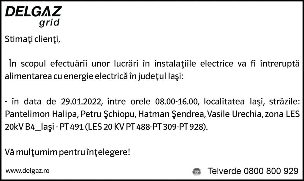 Anunțuri Delgaz gridAnunț Delgaz Grid 26 ianuarie 2022 de RedacțiaJanuary 25, 2022January 25, 20220123 Share0