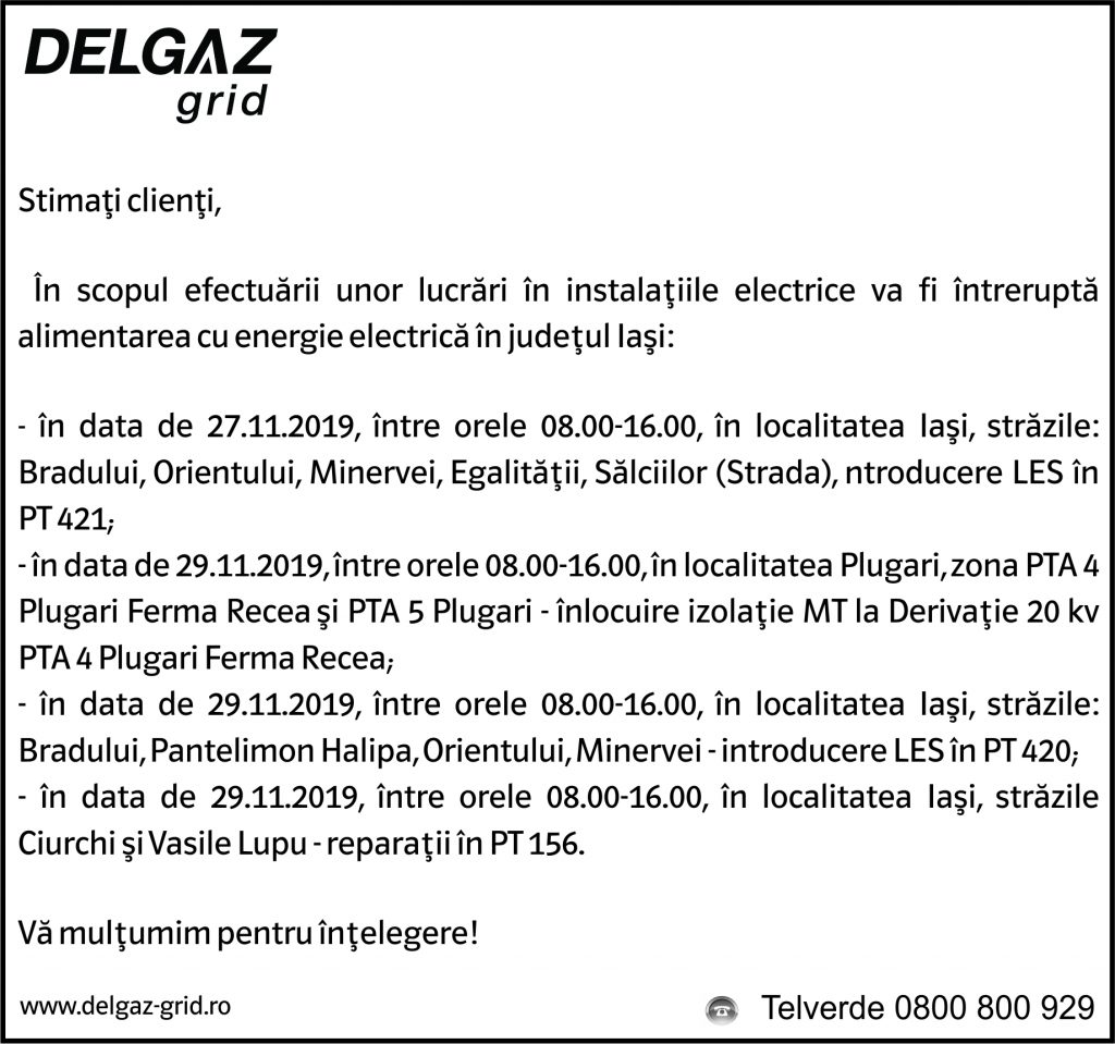 Anunțuri Delgaz gridAnunț Delgaz Grid 26 noiembrie / 1 de Răzvan GrecuNovember 26, 2019November 26, 20190132 Share0