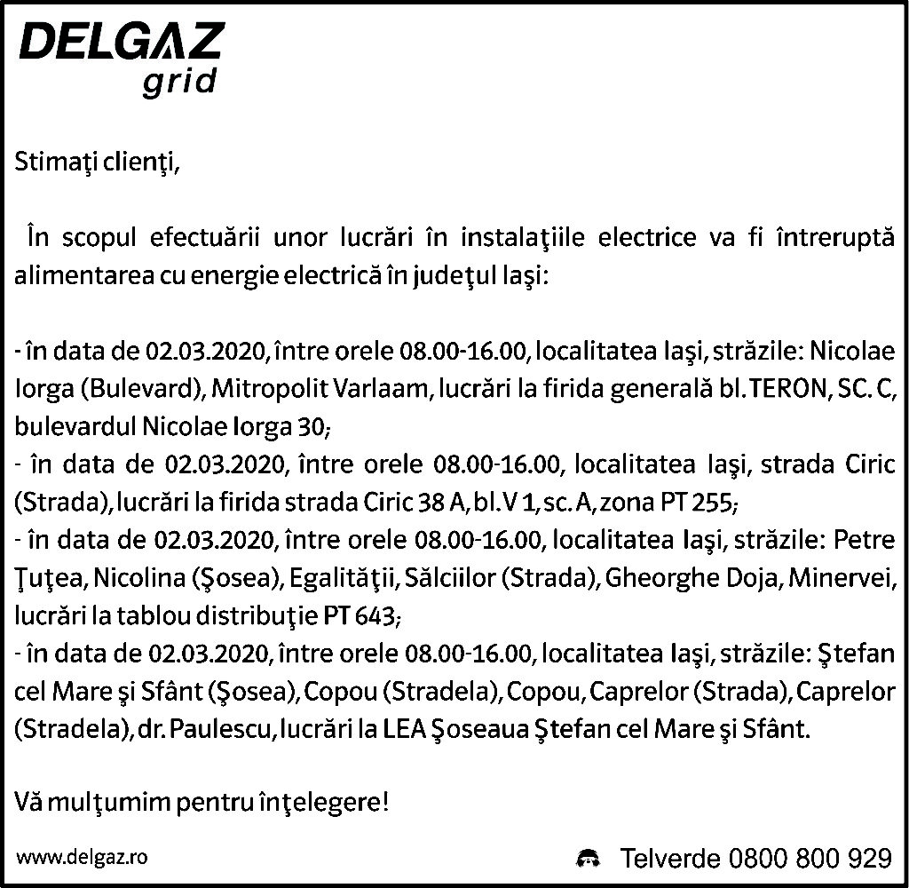Anunțuri Delgaz gridAnunț Delgaz Grid 27 februarie 2020 / 1 de RedacțiaFebruary 26, 2020February 26, 20200102 Share0