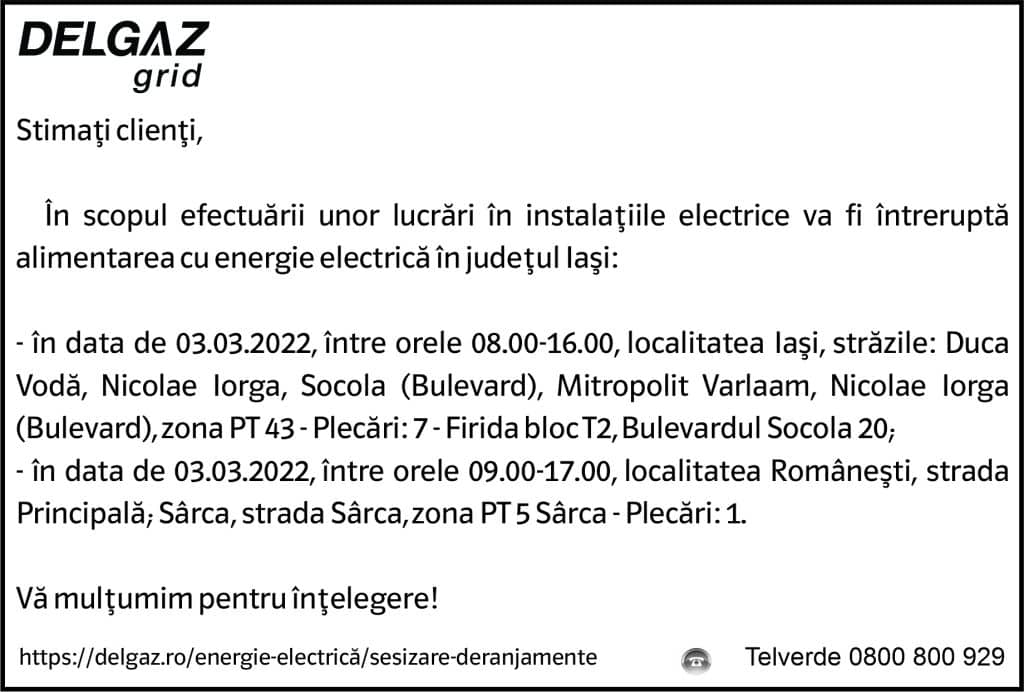 Anunțuri Delgaz gridAnunț Delgaz Grid 28 februarie 2022 / 2 de RedacțiaFebruary 26, 2022February 26, 2022051 Share0