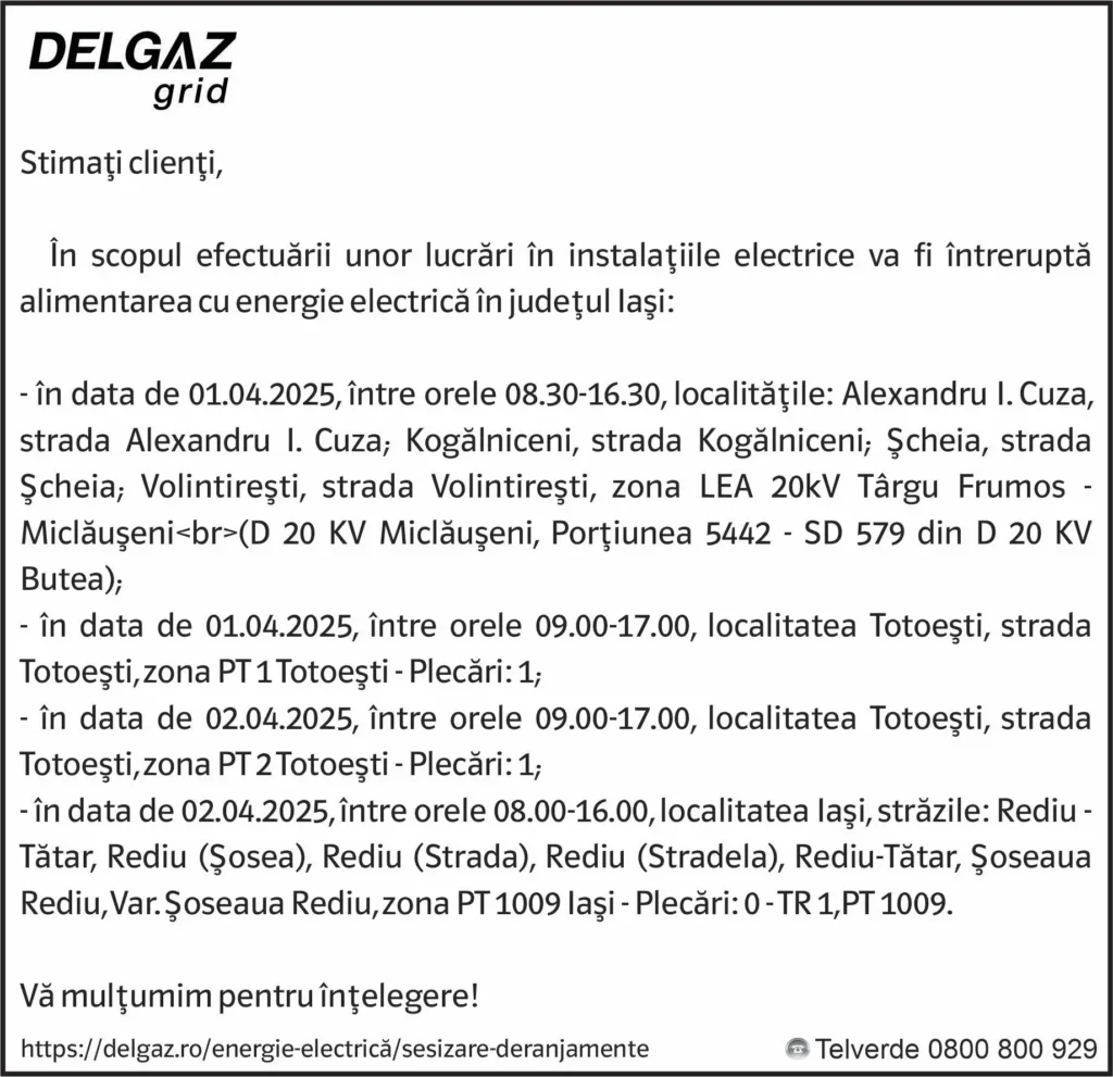 Anunțuri Delgaz gridAnunț Delgaz Grid 28 martie 2025 / 1 de RedacțiaMarch 27, 2025March 27, 2025042 Share0