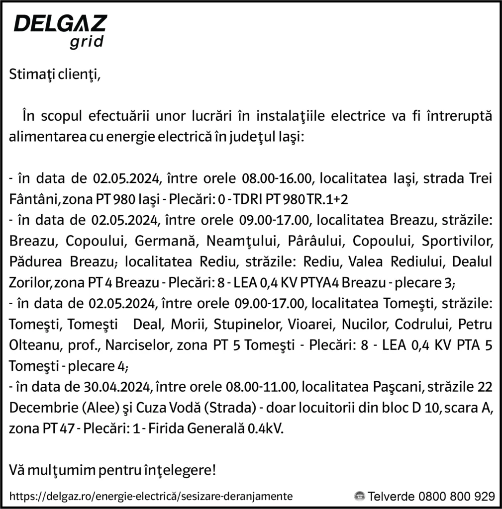 Anunțuri Delgaz gridAnunț Delgaz Grid 29 aprilie 2024 de RedacțiaApril 26, 2024April 26, 2024031 Share0