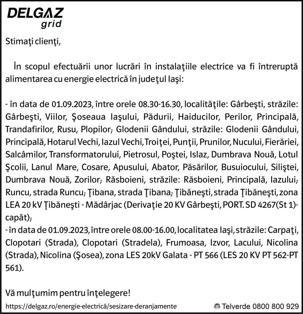 Anunțuri Delgaz gridAnunț Delgaz Grid 29 august 2023 / 2 de RedacțiaAugust 28, 2023August 28, 2023062 Share0