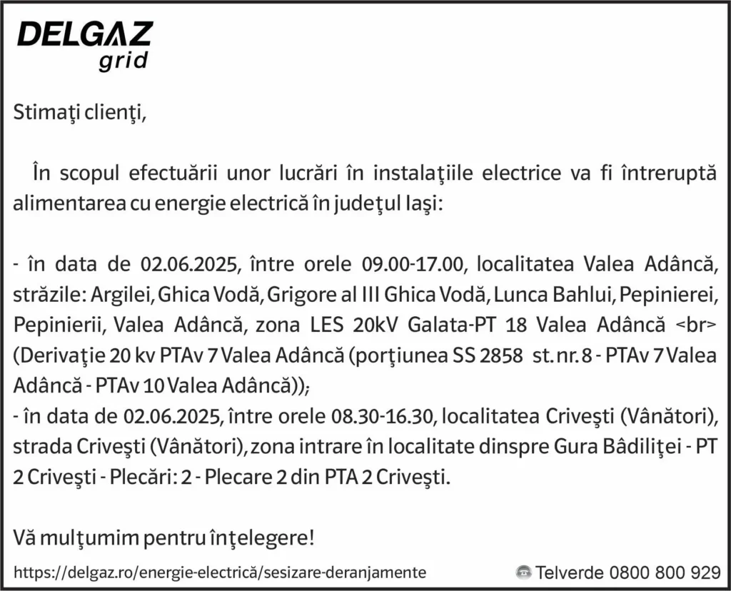 Anunț Delgaz Grid 29 mai 2025 / 1
