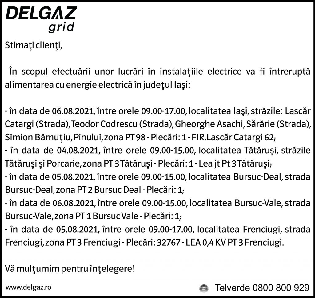 Anunțuri Delgaz gridAnunț Delgaz Grid 3 august 2021 / 2 de RedacțiaAugust 2, 2021August 2, 2021079 Share0