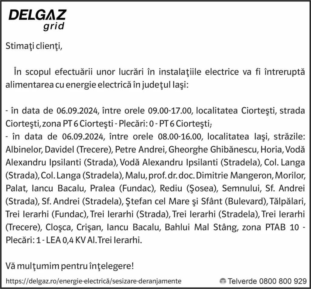Anunțuri Delgaz gridAnunț Delgaz Grid 3 septembrie 2024 / 1 de RedacțiaSeptember 2, 2024September 2, 2024051 Share0