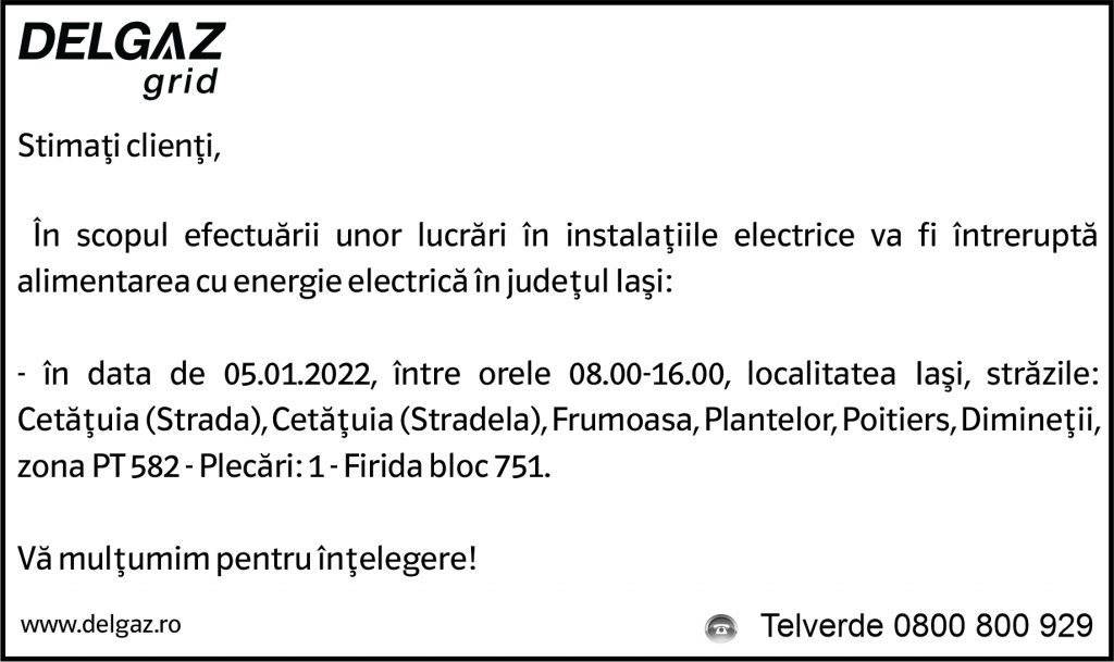 Anunțuri Delgaz gridAnunț Delgaz Grid 30 decembrie 2021 de RedacțiaDecember 30, 2021December 30, 2021046 Share0
