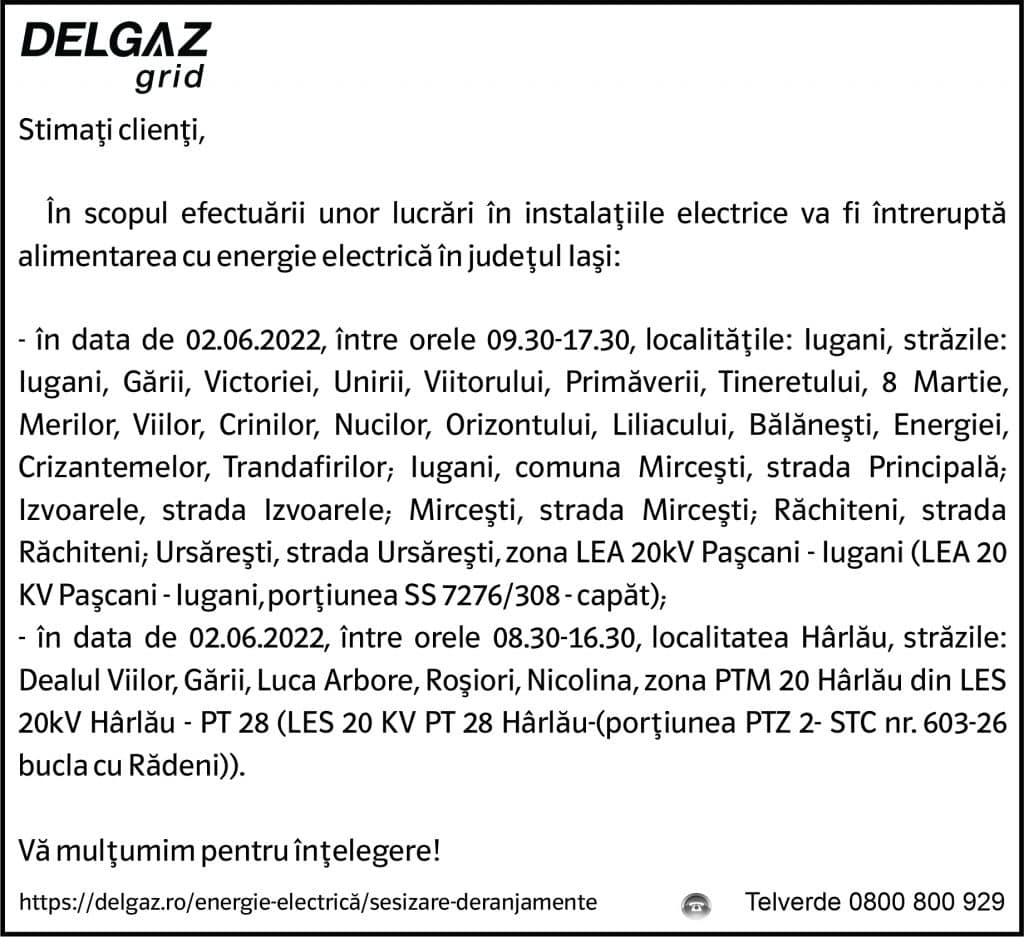 Anunț Delgaz Grid 30 mai 2022