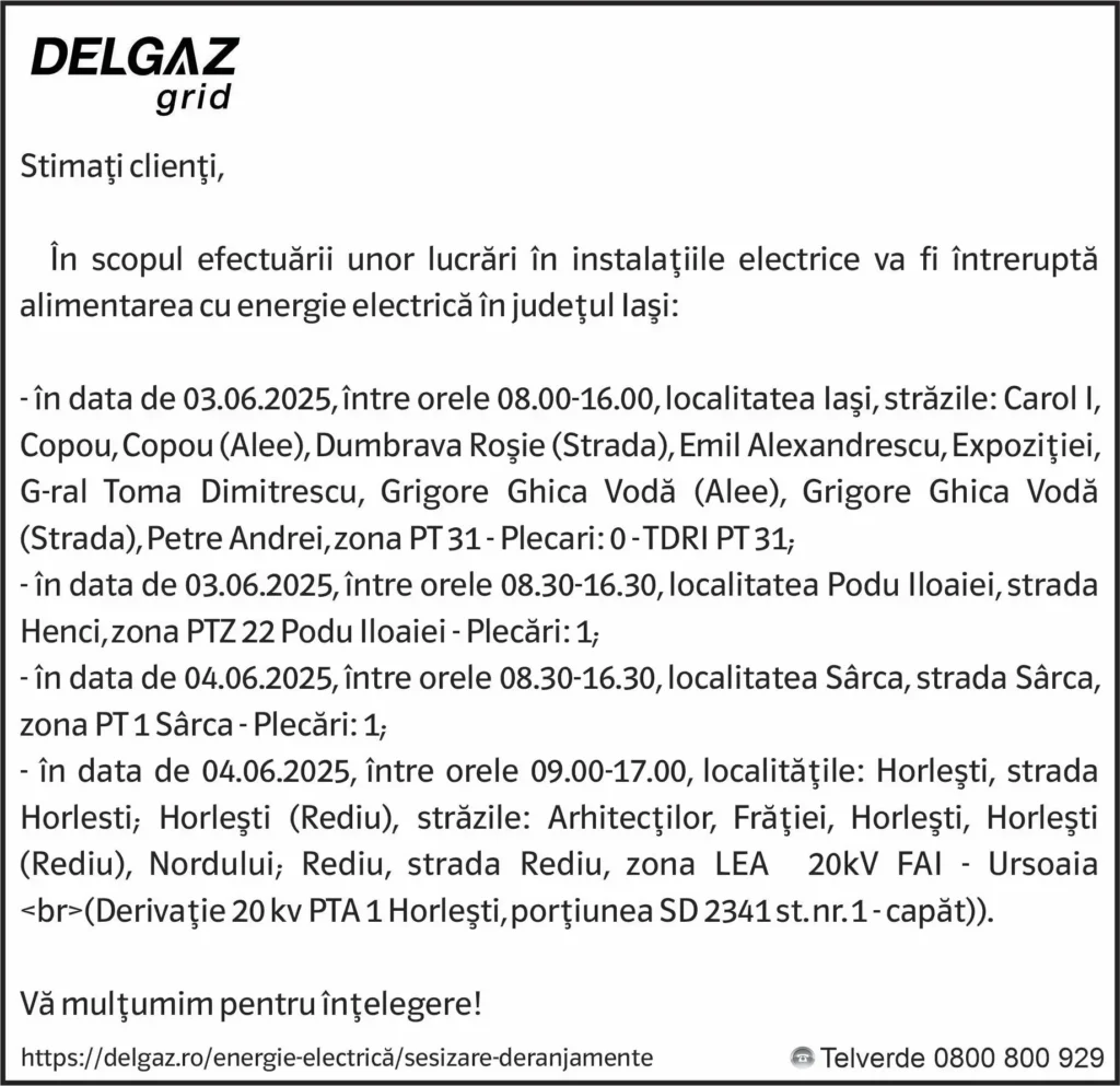 Anunț Delgaz Grid 30 mai 2025 / 1