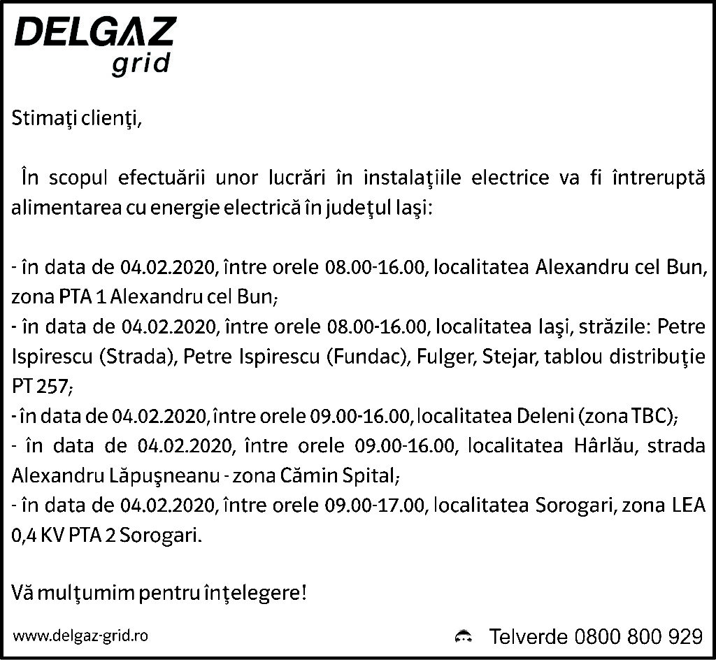 Anunțuri Delgaz gridAnunț Delgaz Grid 31 ianuarie 2020 / 1 de RedacțiaJanuary 31, 2020January 31, 20200101 Share0
