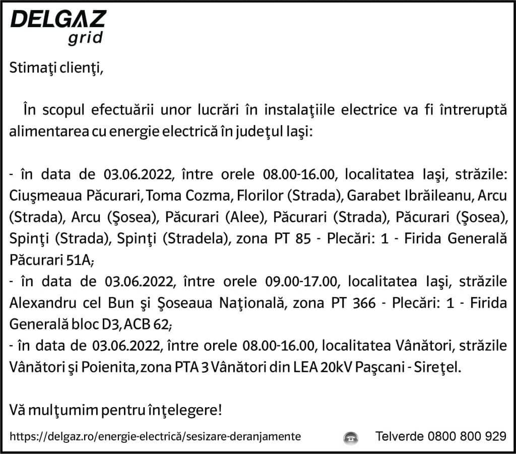 Anunț Delgaz Grid 31 mai 2022 / 1