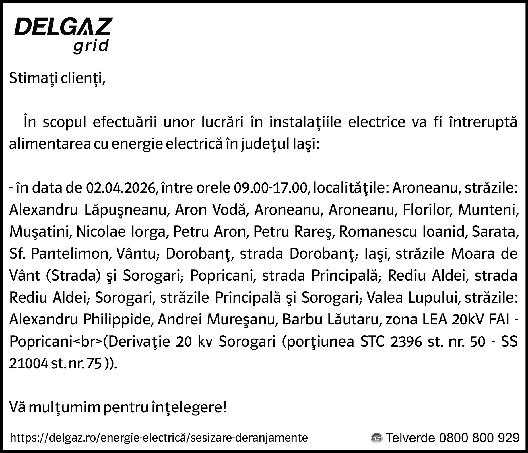 Anunț Delgaz Grid 31 martie 2026 / 1