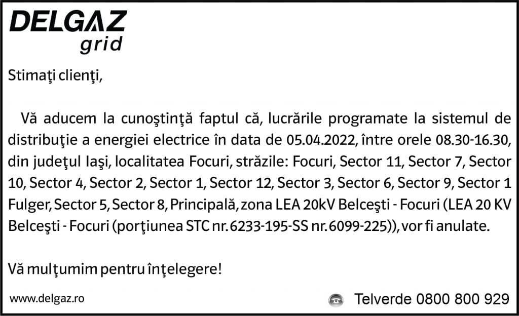 Anunțuri Delgaz gridAnunț Delgaz Grid 4 aprilie 2022 / 2 de RedacțiaApril 4, 2022April 4, 2022043 Share0