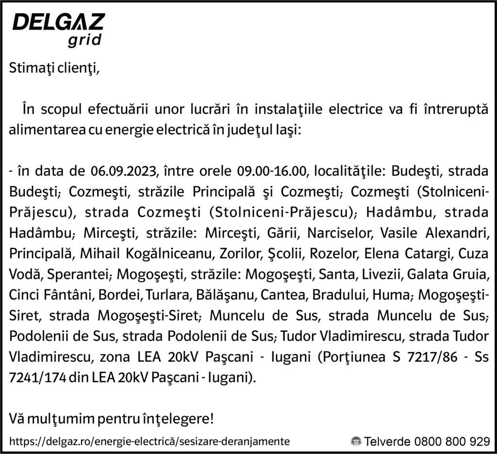 Anunțuri Delgaz gridAnunț Delgaz Grid 4 septembrie 2023 / 2 de RedacțiaSeptember 2, 2023September 2, 2023083 Share0
