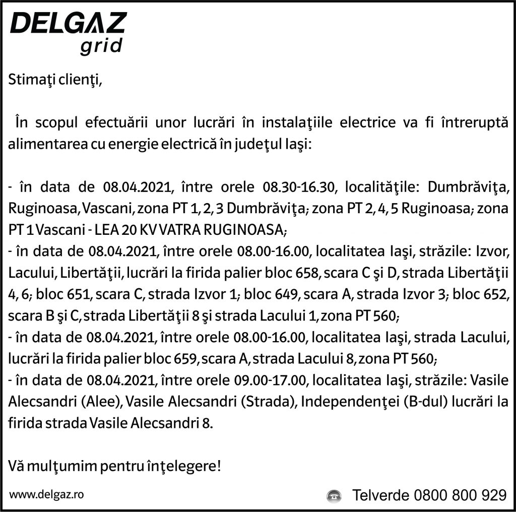 Anunțuri Delgaz gridAnunț Delgaz Grid 5 aprilie 2021 / 1 de RedacțiaApril 3, 2021April 3, 2021035 Share0