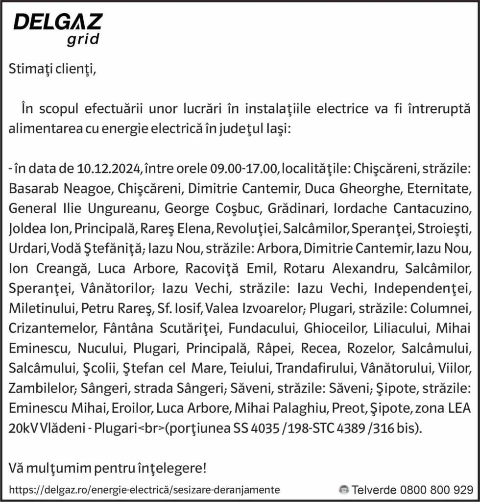 Anunțuri Delgaz gridAnunț Delgaz Grid 6 decembrie 2024 / 1 de RedacțiaDecember 5, 2024December 5, 2024039 Share0