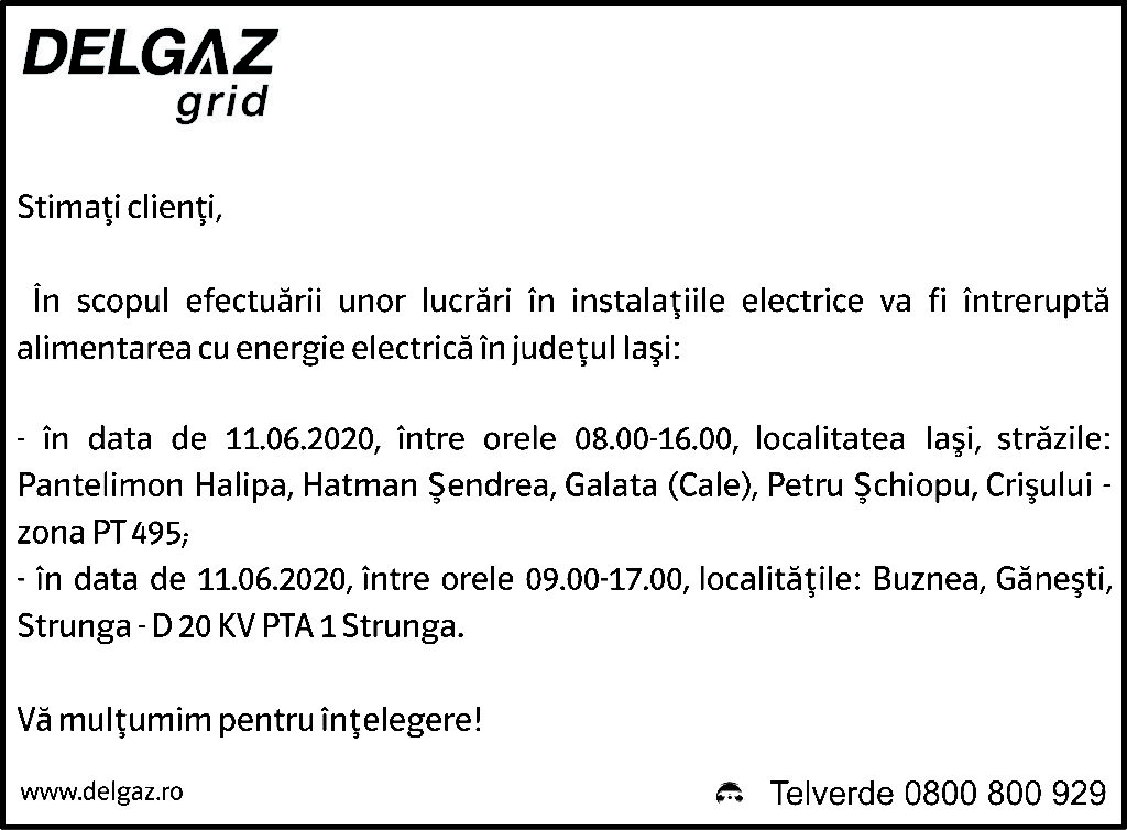 Anunțuri Delgaz gridAnunț Delgaz Grid 6 iunie 2020 / 1 de RedacțiaJune 5, 2020June 5, 20200107 Share0