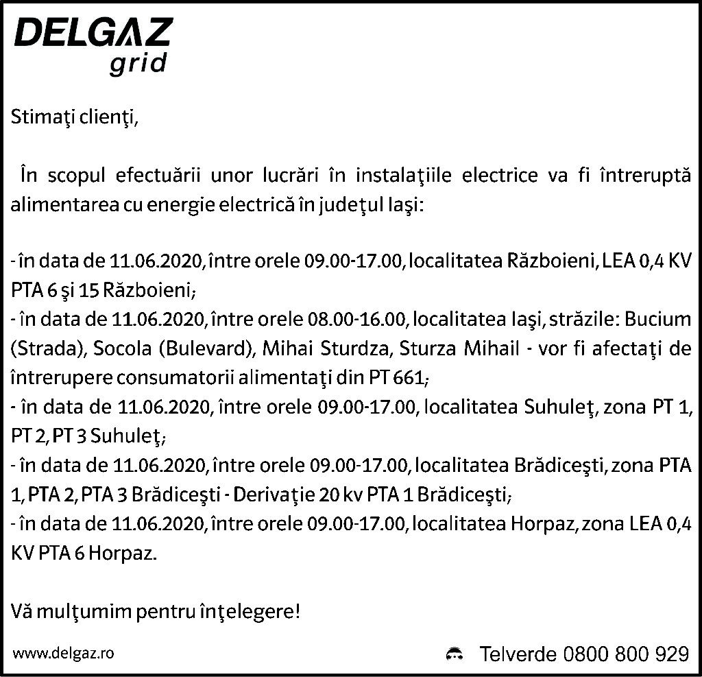 Anunțuri Delgaz gridAnunț Delgaz Grid 6 iunie 2020 / 2 de RedacțiaJune 5, 2020June 5, 20200105 Share0
