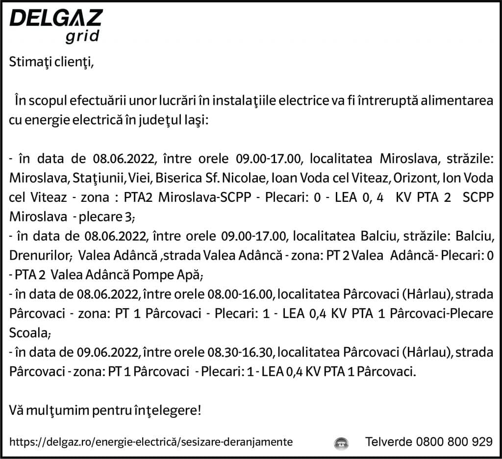 Anunț Delgaz Grid 31 mai 2022 / 2