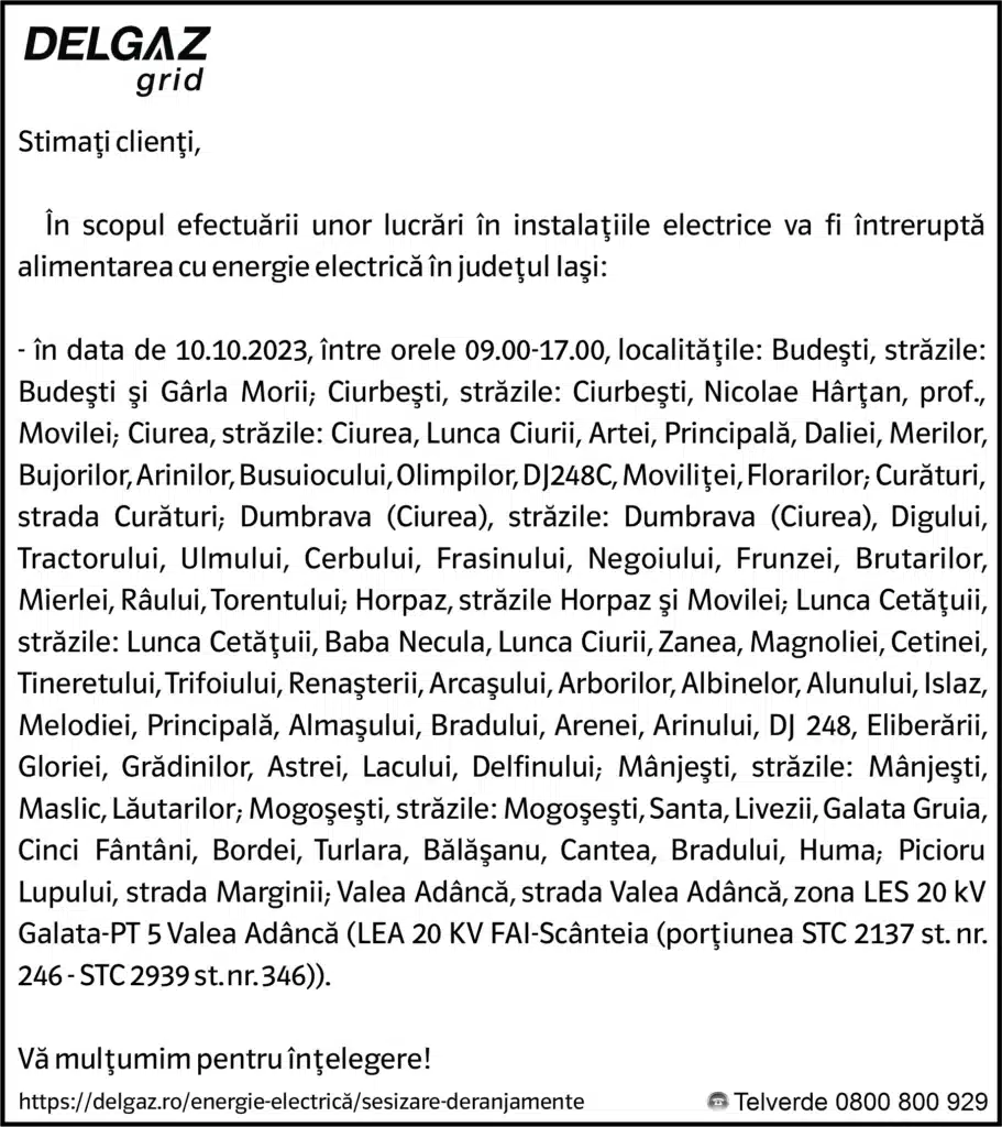 Anunțuri Delgaz gridAnunț Delgaz Grid 6 octombrie 2023 / 1 de RedacțiaOctober 5, 2023October 5, 2023032 Share0