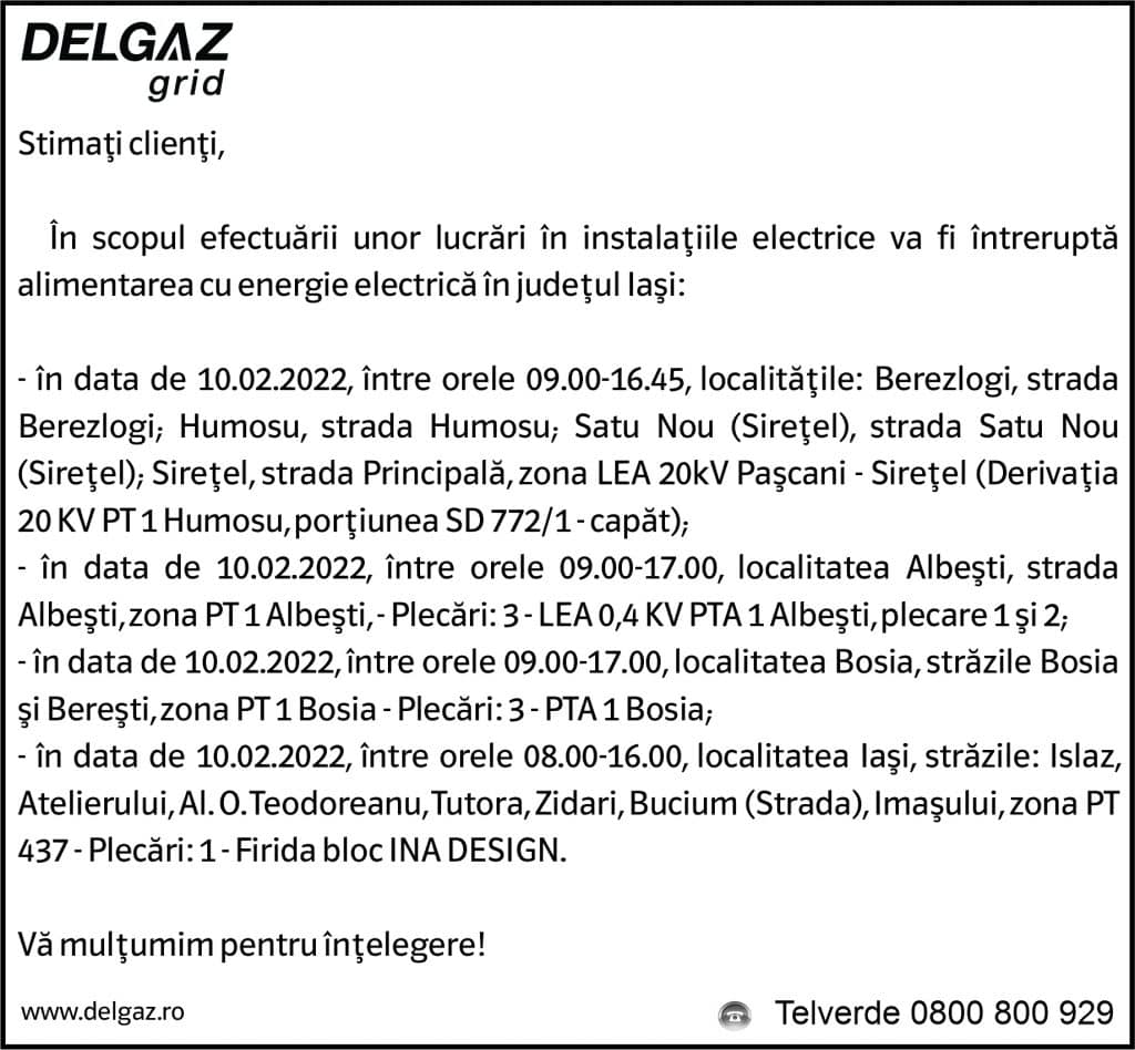 Anunțuri Delgaz gridAnunț Delgaz Grid 7 februarie 2022 / 1 de RedacțiaFebruary 5, 2022February 5, 2022060 Share0