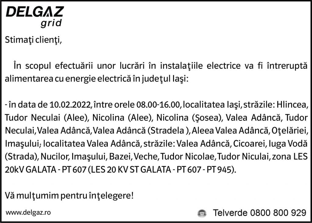 Anunțuri Delgaz gridAnunț Delgaz Grid 7 februarie 2022 / 2 de RedacțiaFebruary 5, 2022February 5, 2022055 Share0