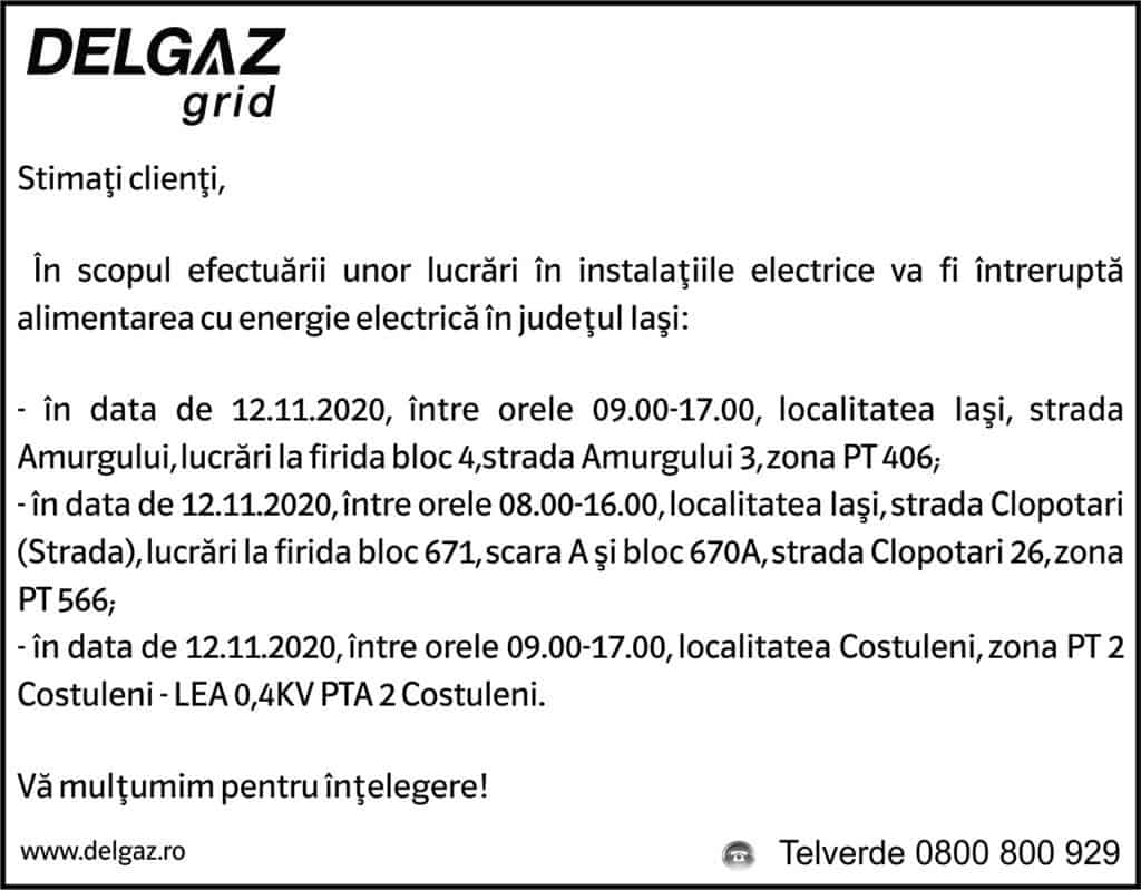 Anunțuri Delgaz gridAnunț Delgaz Grid 7 noiembrie 2020 / 2 de RedacțiaNovember 7, 2020November 7, 2020028 Share0