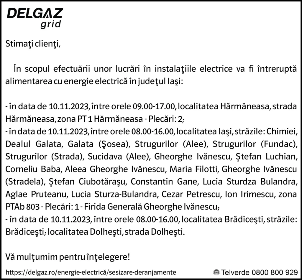 Anunțuri Delgaz gridAnunț Delgaz Grid 7 noiembrie 2023 / 1 de RedacțiaNovember 6, 2023November 6, 2023061 Share0