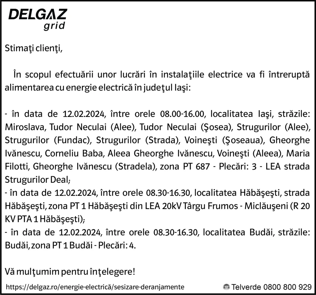 Anunțuri Delgaz gridAnunț Delgaz Grid 8 februarie 2024 / 1 de RedacțiaFebruary 7, 2024February 7, 2024036 Share0