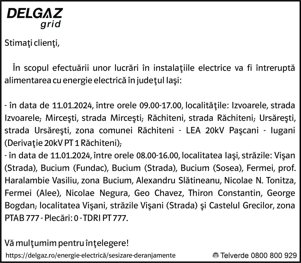 Anunțuri Delgaz gridAnunț Delgaz Grid 8 ianuarie 2024 de RedacțiaJanuary 7, 2024January 7, 20240105 Share0