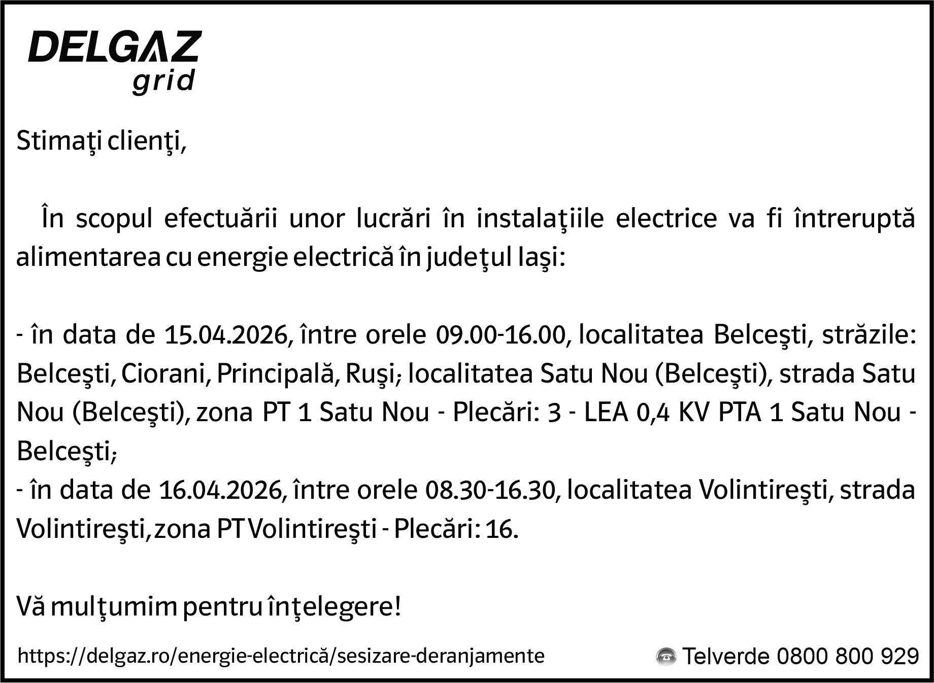 Anunț Delgaz Grid 9 aprilie 2026 / 2