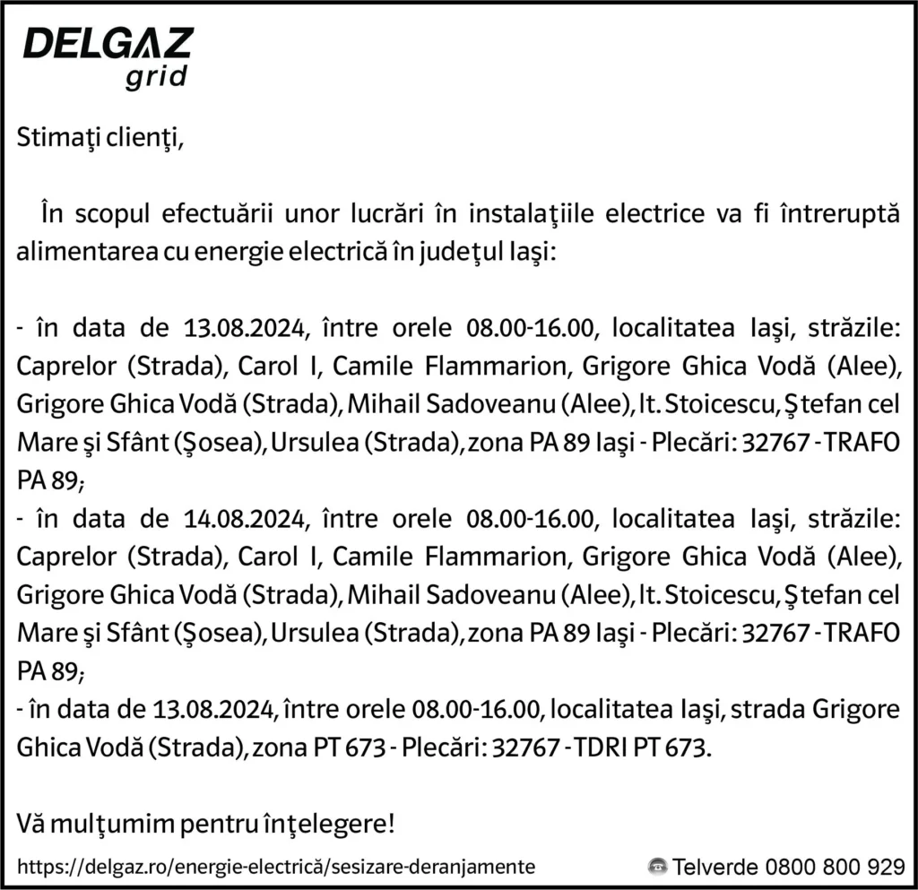 Anunțuri Delgaz gridAnunț Delgaz Grid 9 august 2024 / 3 de RedacțiaAugust 8, 2024August 8, 2024022 Share0