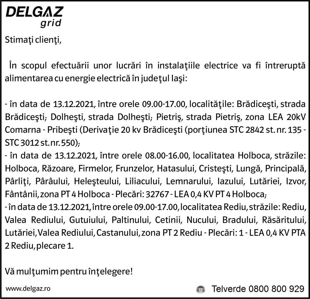Anunțuri Delgaz gridAnunț Delgaz Grid 9 decembrie 2021 / 1 de RedacțiaDecember 8, 2021December 8, 2021048 Share0
