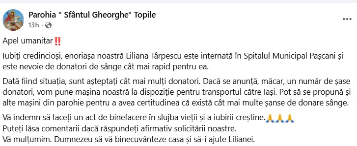 ”Apel umanitar! Iubiți credincioși, enoriașa noastră Liliana Târpescu este internată în Spitalul Municipal Pașcani și este nevoie de donatori de sânge cât mai rapid pentru ea.Dată fiind situația, sunt așteptați cât mai mulți donatori. Dacă se anunță, măcar, un număr de șase donatori, vom pune mașina noastră la dispoziție pentru transportul către Iași. Pot să se propună și alte mașini din parohie pentru a avea certitudinea că există cât mai multe șanse de donare sânge.Vă îndemn să faceți un act de binefacere în slujba vieții și a iubirii creștine.Puteți lăsa comentarii dacă răspundeți afirmativ solicitării noastre.Vă mulțumim. Dumnezeu să vă binecuvânteze casa și să-i ajute Lilianei“.