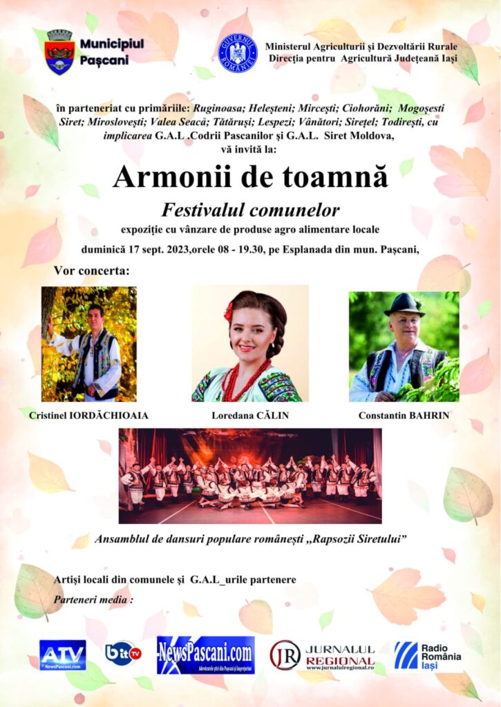”Municipiul Pașcani, ȋn parteneriat cu Direcția pentru Agricultură Judeṭeană Iaṣi, vă invită duminică, 17 septembrie 2023 la evenimentul „Armonii de toamnă – Festivalul Comunelor”, ce va avea loc începând cu ora 08:00 pe Esplanada din Municipiul Paṣcani.Evenimentul este organizat cu sprijinul ṣi implicarea primăriilor comunelor: Ruginoasa; Heleșteni; Mircești; Ciohorăni; Mogoșesti-Siret; Miroslovești; Valea Seacă; Tătăruși; Lespezi; Vânători; Sirețel; Todirești, precum și a G.A.L. Codrii Pașcanilor și G.A.L. Siret Moldova, care vor prezenta ỉn standurile proprii, realizările, perspectivele ṣi oportunităṭile locale, dar şi producători locali de produse agroalimentare . La eveniment vor participa producători locali, prestatori de servicii și meșteri populari din cele 12 localități participante, din jurul municipiului, care-și vor promova produsele și serviciile pe care le oferă.Tot în cadrul acestui eveniment vor evolua pe scenă, începȃnd cu ora 11:30 artiṣtii de muzică populară (Cristinel Iordăchioaia, Loredana Călin, Constantin Bahrin, dar şi artişti/formaţii artistice din localităṭile participante”, conform unui comunicat de presă transmis de Primăria Pașcani.