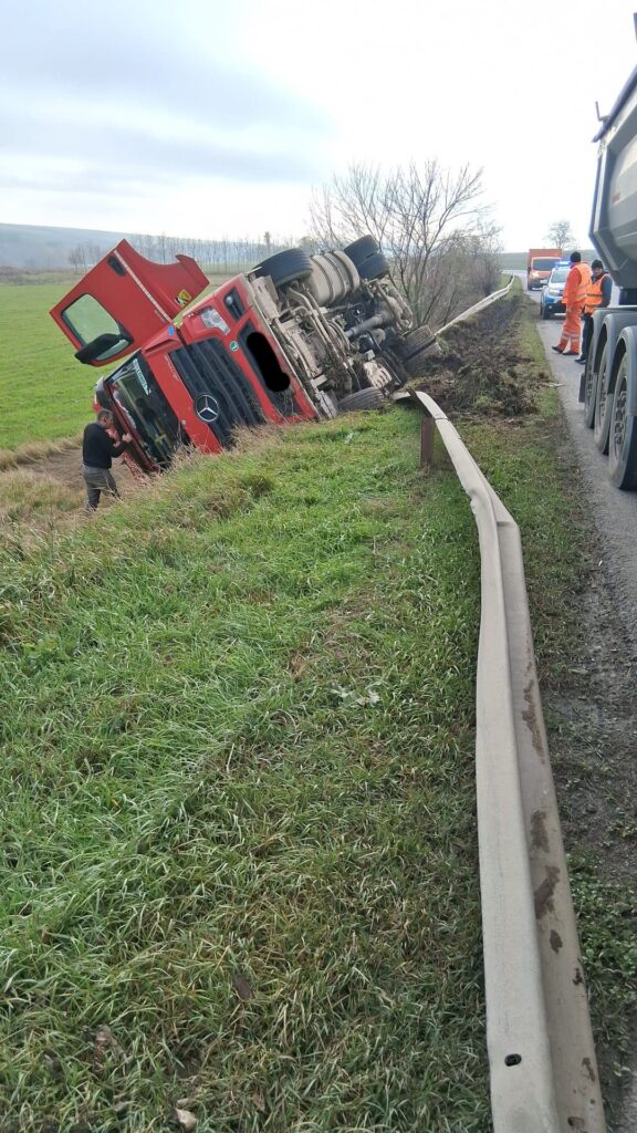 Un autotren s-a răsturnat joi pe Drumul Național 28, la kilometrul 17+350, în apropiere de localitatea Strunga, județul Iași.