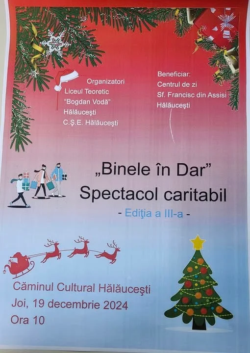Joi, 19 decembrie 2024, la ora 10:00, Căminul Cultural din Hălăucești va fi gazda celei de-a treia ediții a spectacolului caritabil „Binele în dar”. Organizat de Liceul Teoretic „Bogdan Vodă” Hălăucești, împreună cu Consiliul Școlar al Elevilor, evenimentul are ca scop sprijinirea Centrului de zi Sf. Francisc din Assisi.